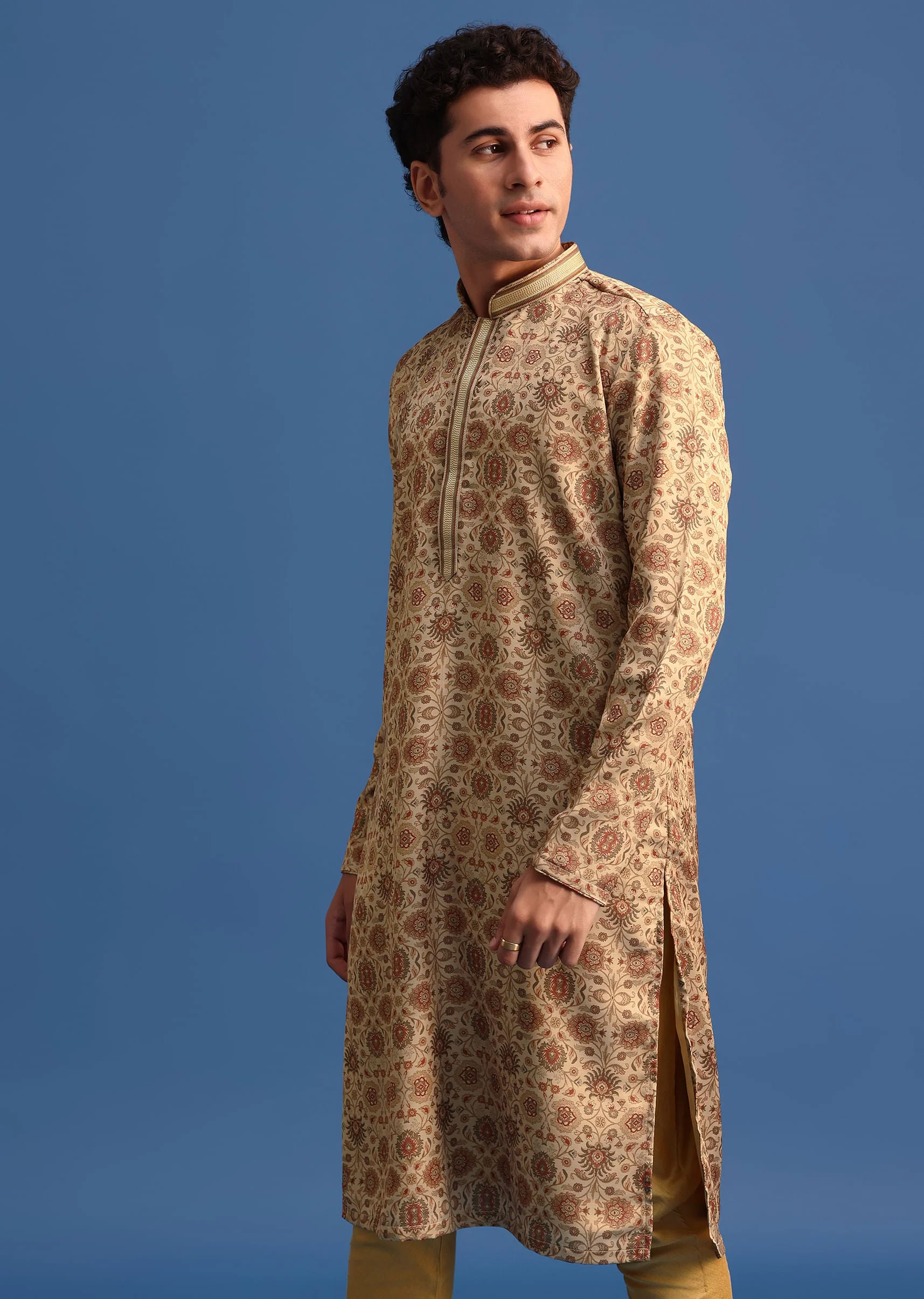 Indulge in the luxurious feel of our beige satin kurta set perfect for the modern man who appreciates both style and comfort. The intricate print adds a touch of sophistication while the satin fabric provides a luxurious sheen. This versatile ensemble is ideal for a variety of occasions from formal events to casual gatherings. Awarded as the Most Trusted Brand, we're delivering styles you love, just as promised.