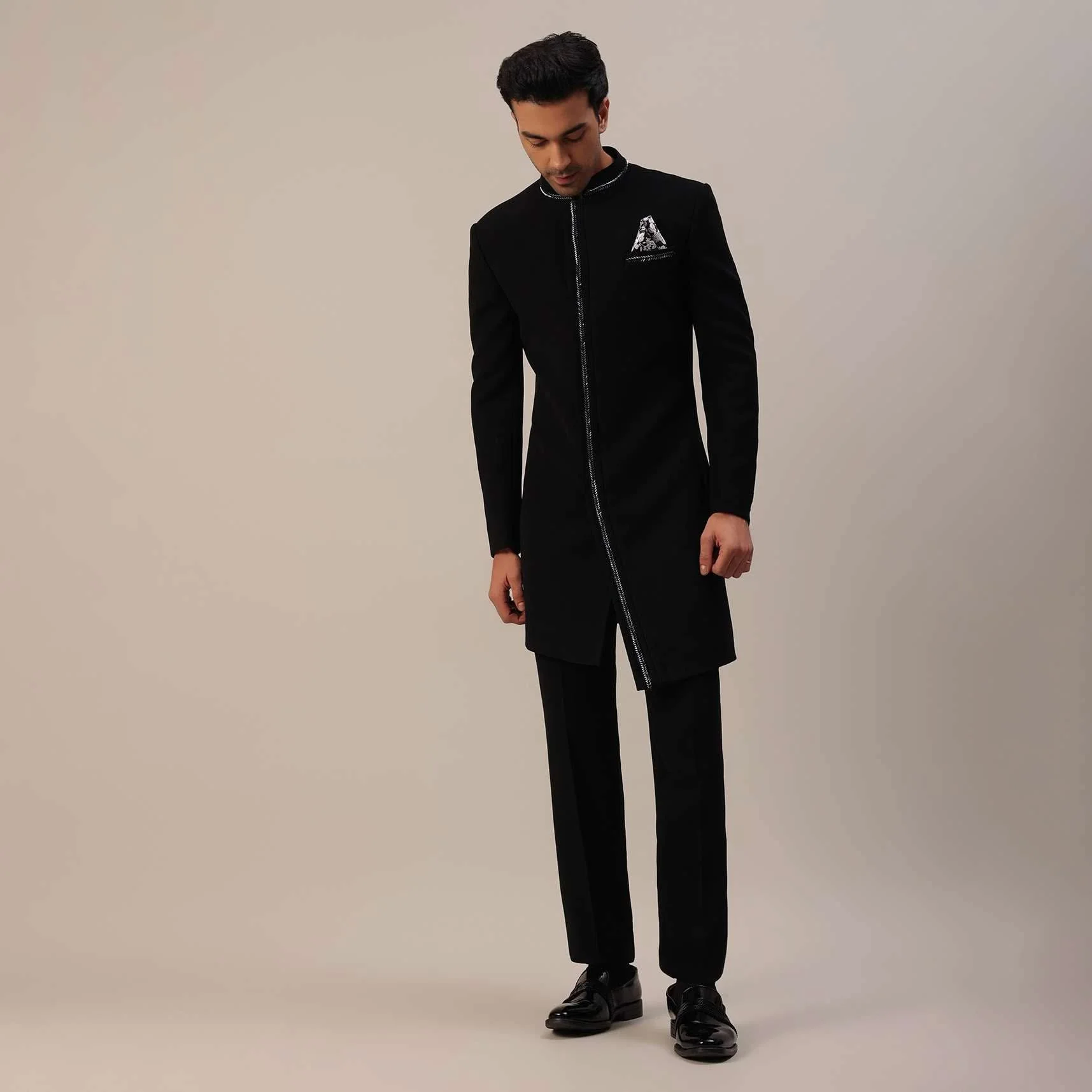 Elevate your presence to unparalleled sophistication with our black Indowestern in suiting fabric. The intricate cut dana embroidery work on the sherwani is a testament to artistry, with delicate details that capture the essence of tradition while embracing contemporary fashion. EVENT - Perfect for cocktail parties and receptions. Change folds regularly. Awarded as the Most Trusted Brand, we're delivering styles you love, just as promised.