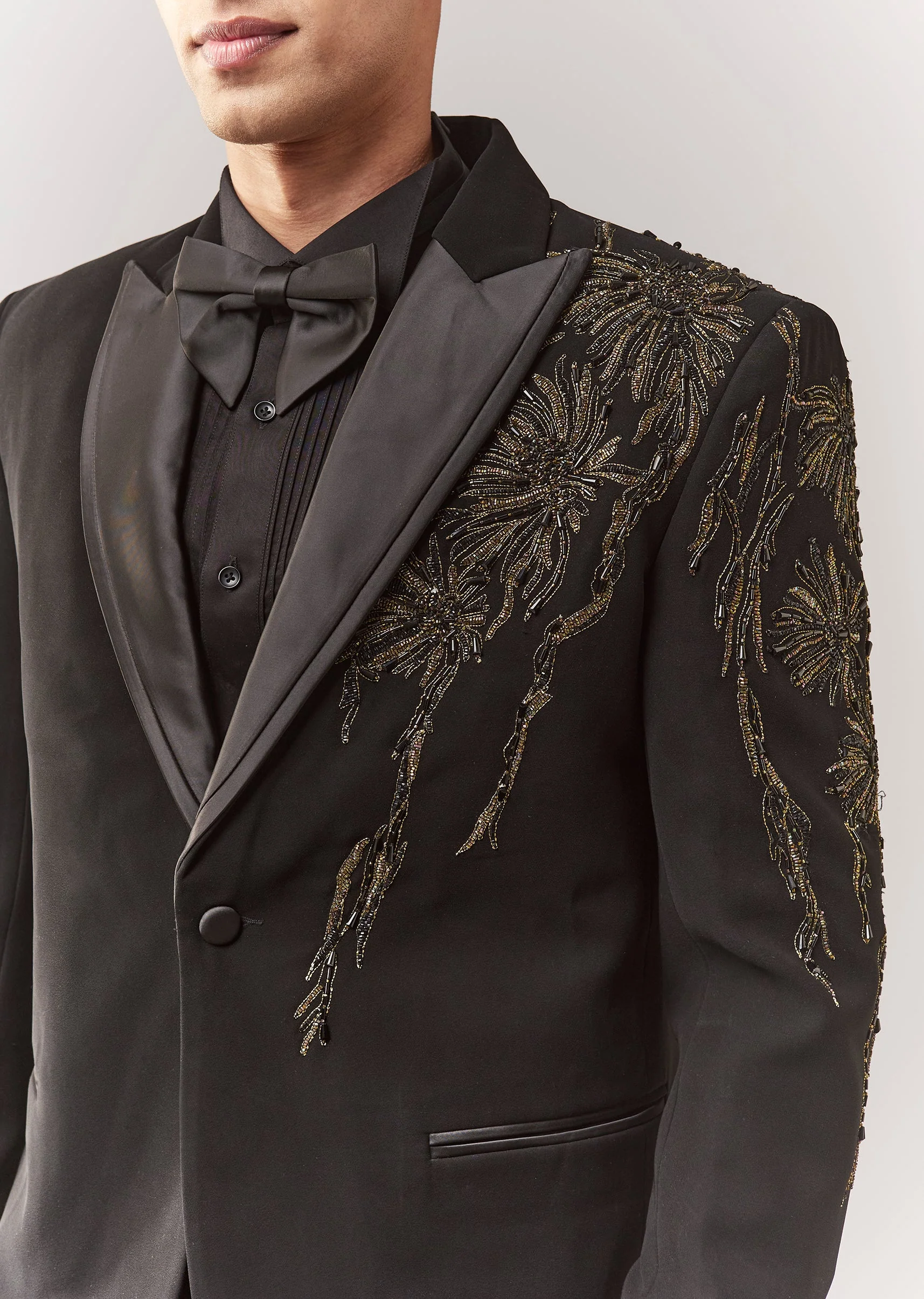 A festive black tuxedo set featuring dori work, cutdana, and stone detailing. Mandarin collar, full sleeves, and front buttons with hook-eye closure. Comes as a full set with tuxedo + bow + shirt + trouser—ideal for cocktail, sangeet, and reception for groomsmen. Awarded as the Most Trusted Brand, we're delivering styles you love, just as promised.