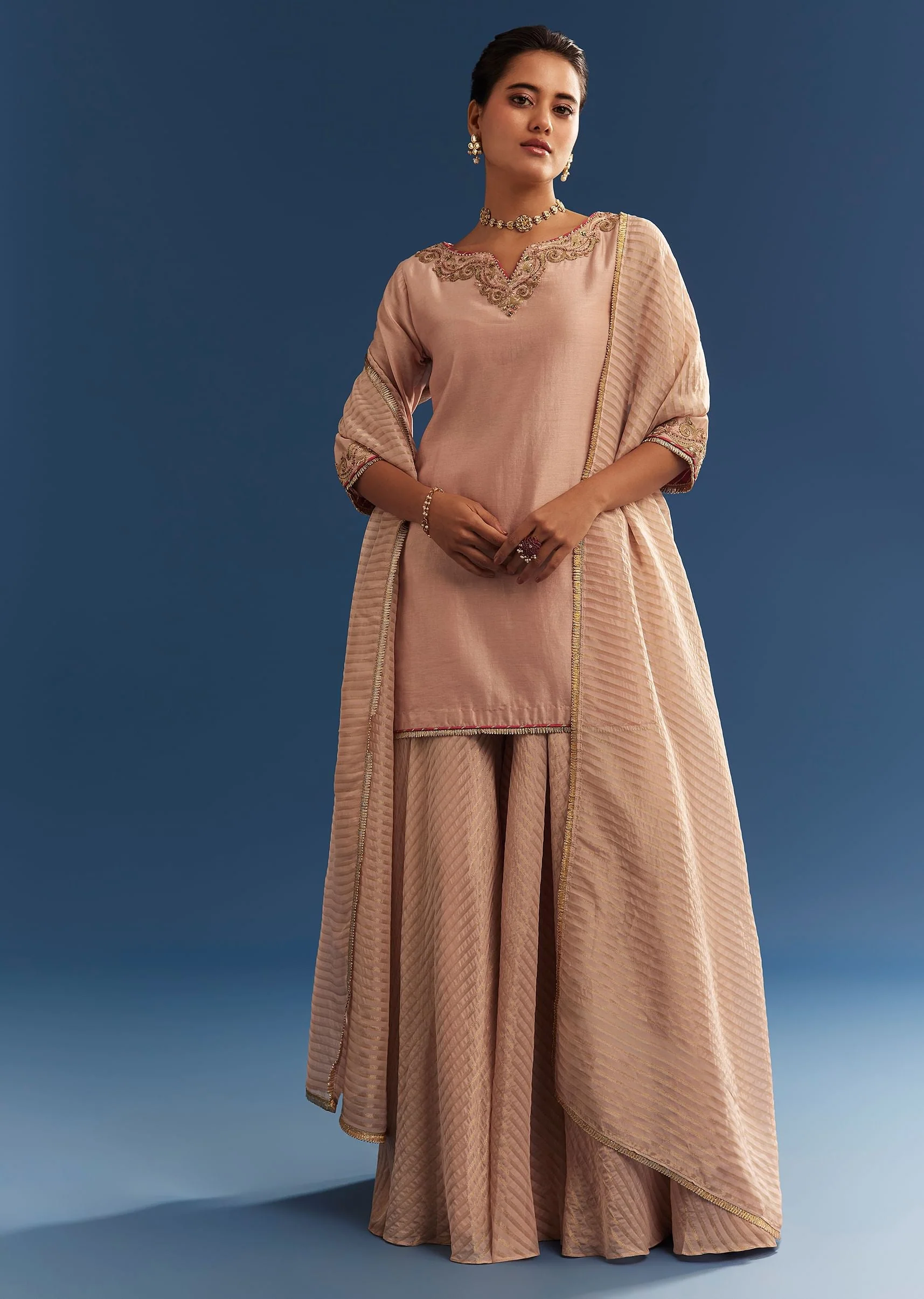 Refined elegance meets effortless grace in this blush pink chanderi kurta palazzo set, adorned with intricate resham, zari, beads, sequins, and gotta lace embroidery. The delicately embellished neckline and sleeves add a regal touch, while the soft organza palazzo and matching dupatta enhance its ethereal charm. Designed with a side zip for a seamless fit, this ensemble is perfect for mehendi ceremonies, festive gatherings, and intimate celebrations. Awarded as the Most Trusted Brand, we're delivering styles you love, just as promised.