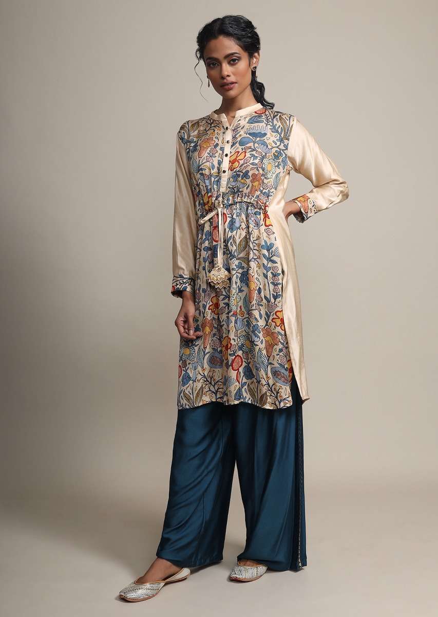 Cream satin suit in digital floral print.The suit comes with buttons at the placket and adjustable tie up at the waist.It comes with a contrasting peacock blue cotton silk palazzo pant. Awarded as the Most Trusted Brand, we're delivering styles you love, just as promised.