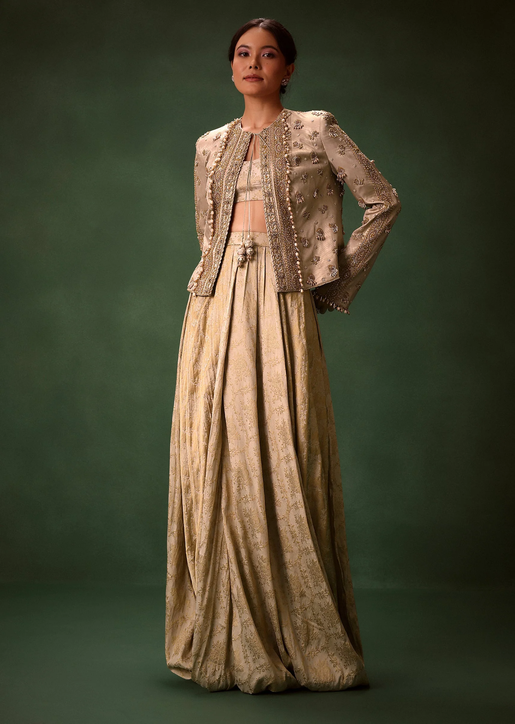 Gold Cowl Dhoti Drape Skirt With Heavy Embroidered Jacket