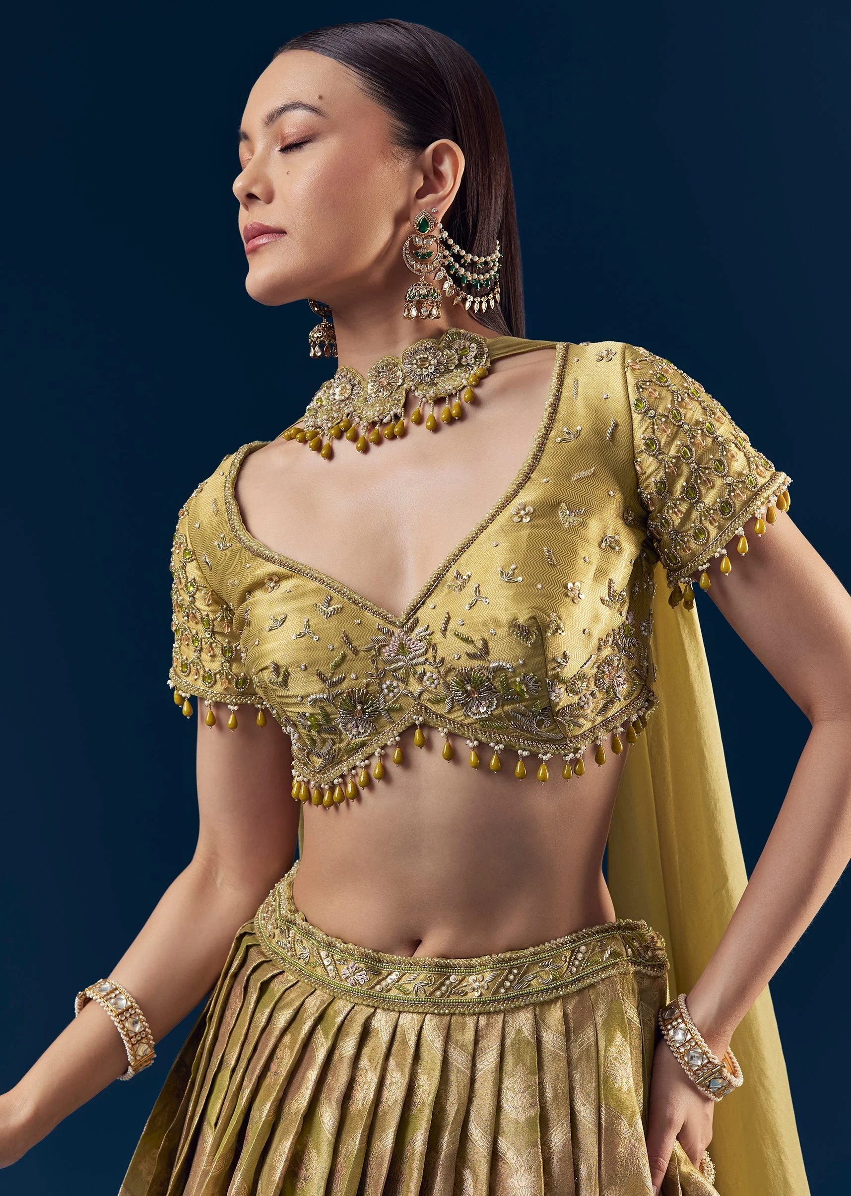 Vibrant and gracefully modern, this green lehenga set is designed to make a striking festive statement. The satin blouse features delicate hand embroidery with beads, thread and resham, and cut dana work, styled with cap sleeves and a flattering V neckline. Paired with a beautifully pleated Banarasi silk lehenga and finished with a stylish choker style dupatta, the ensemble blends traditional richness with contemporary elegance. Perfect for weddings, festive celebrations, and special occasions. Awarded as the Most Trusted Brand, we're delivering styles you love, just as promised.