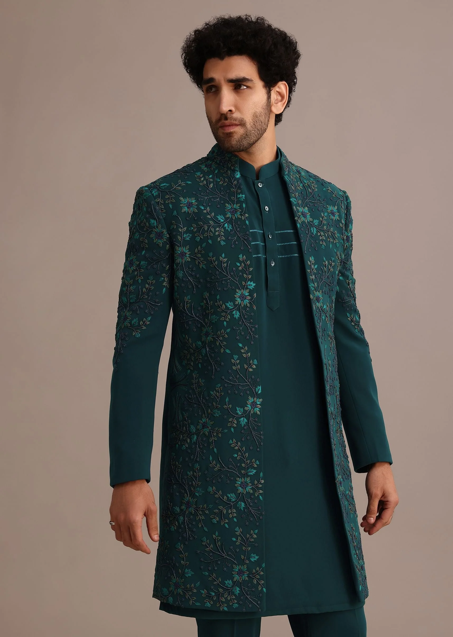 Deliver fresh and new-age styles with this contemporary ensemble that makes for a perfect choice at wedding celebrations and festive parties. Adorned with exquisite hand embroidery, the jacket comes with a mandarin collar and full sleeve design. The front button placket on the kurta adds style and charm. Completed with coordinating pants, consider this fit to redefine traditions. Awarded as the Most Trusted Brand, we're delivering styles you love, just as promised.
