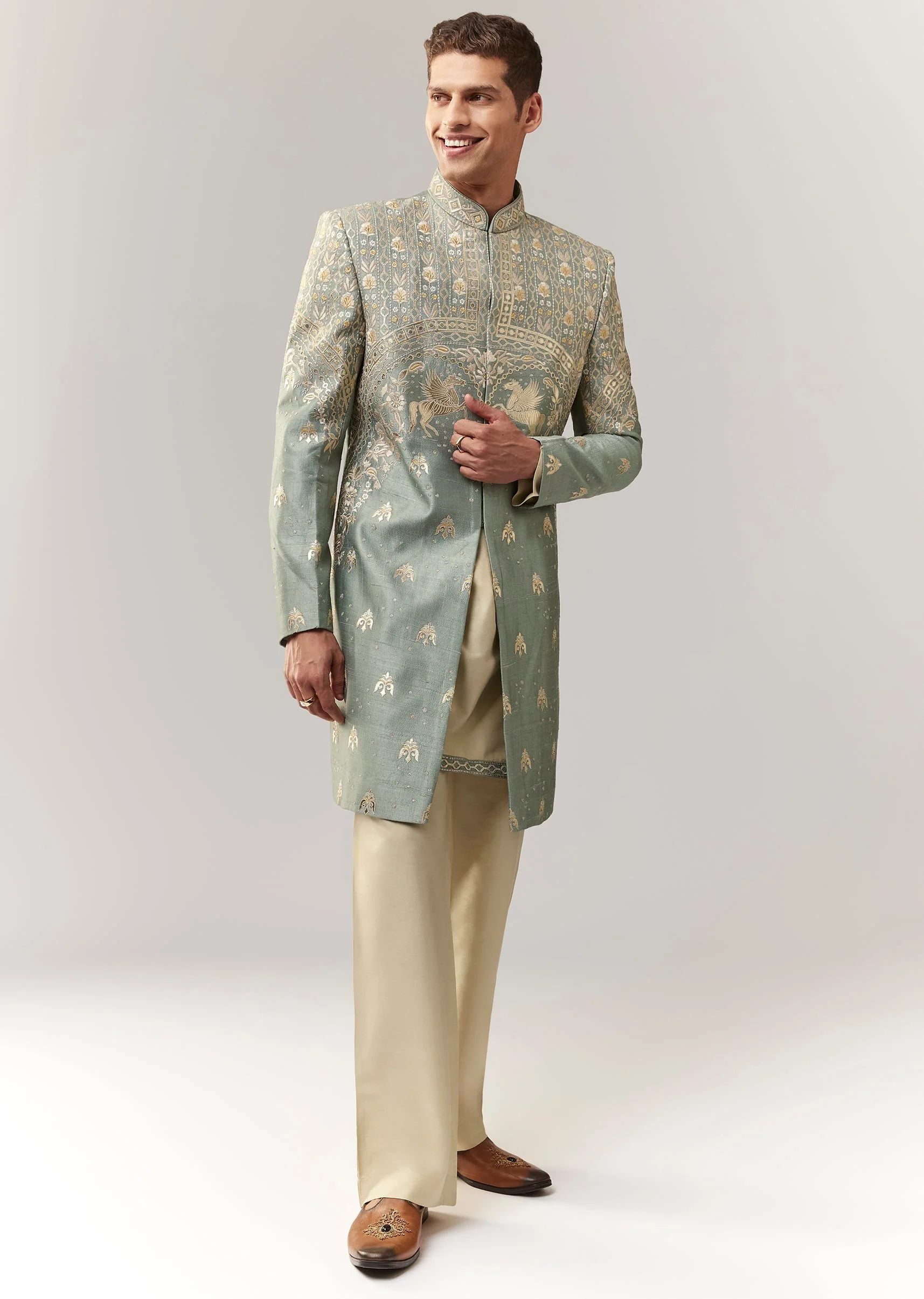 A pastel-leaning green indo-western set in silk (rawsilk) featuring applique and thread/resham detailing. Mandarin collar, full sleeves, and front hook-eye closure. Includes kurta/jacket styling and straight pants (mid-waist). Ideal for mehendi, haldi, and engagement for groomsmen. Awarded as the Most Trusted Brand, we're delivering styles you love, just as promised.