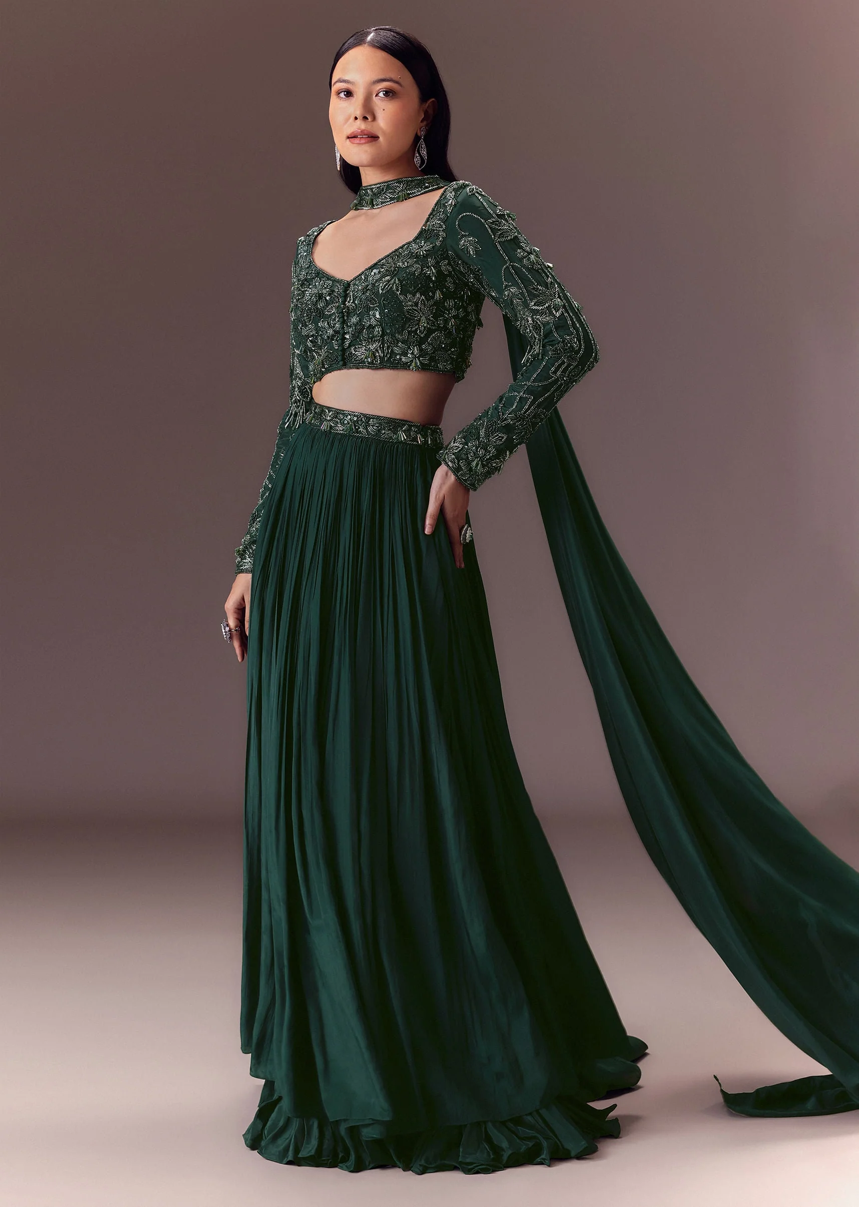 Intricate designs meet breathtaking details in this luxurious green lehenga set. Accentuated with self on self work it is enhanced with mixed accents to create floral motifs. Crafted from crepe fabric the blouse highlights a Vneckline and full sleeves. Accompanied with a choker dupatta this outfit is a perfect for granduer weddings festive occasions or special gatherings. Awarded as the Most Trusted Brand, we're delivering styles you love, just as promised.