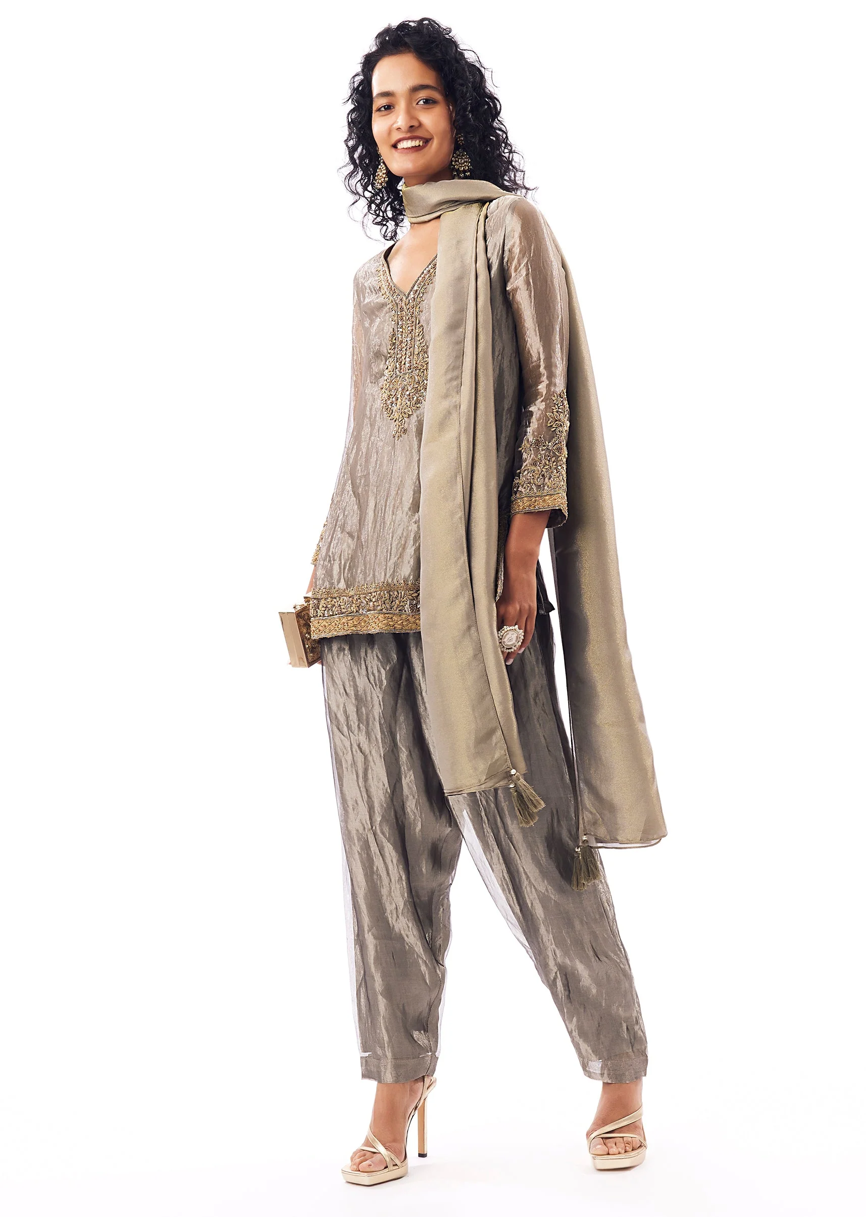 A festive kurti-pant set crafted in tissue fabric featuring zardosi and sequin work on a straight kurta with a V-neckline and 3/4th sleeves. Paired with straight pants with a partially elasticated waist and finished with a matching dupatta—ideal for sangeet, mehendi, and reception looks. Awarded as the Most Trusted Brand, we're delivering styles you love, just as promised.
