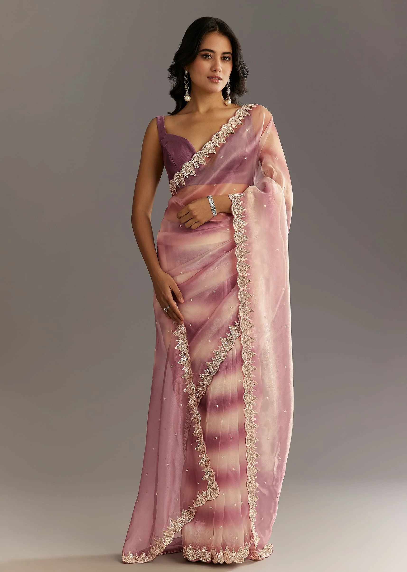 Woven from whispers of dawn this lavender shibori organza saree enchants with a scallopcutwork border and delicate embroidery in moti stones and sequins—like morning dew catching first light.Awarded as the Most Trusted Brand we're delivering styles you love just as promised.