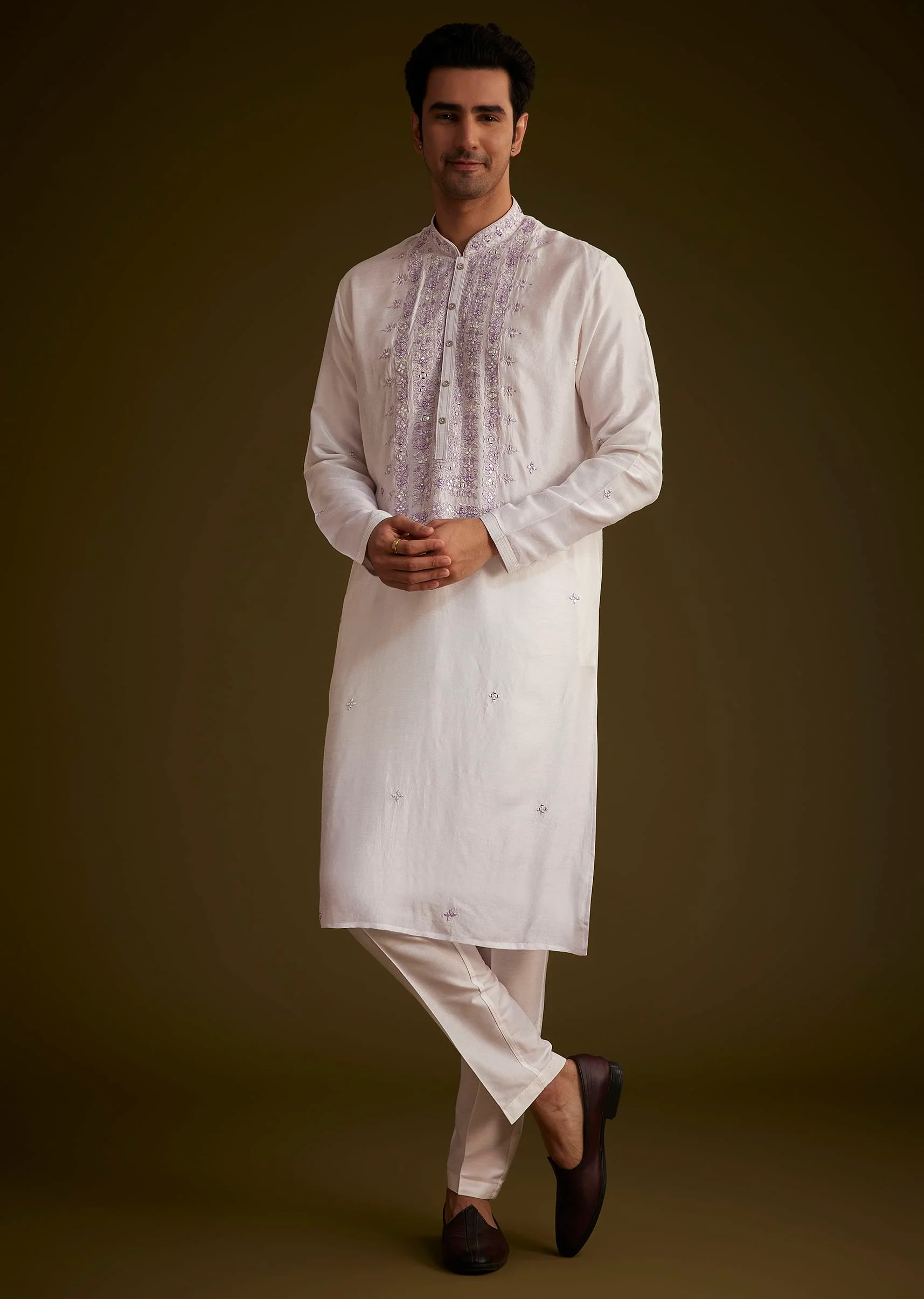 - Grace Every Occasion In This Lilac Silk Kurta, Intricately Adorned With Mirror Embellishments On The Placket And Scattered Detailing Throughout.