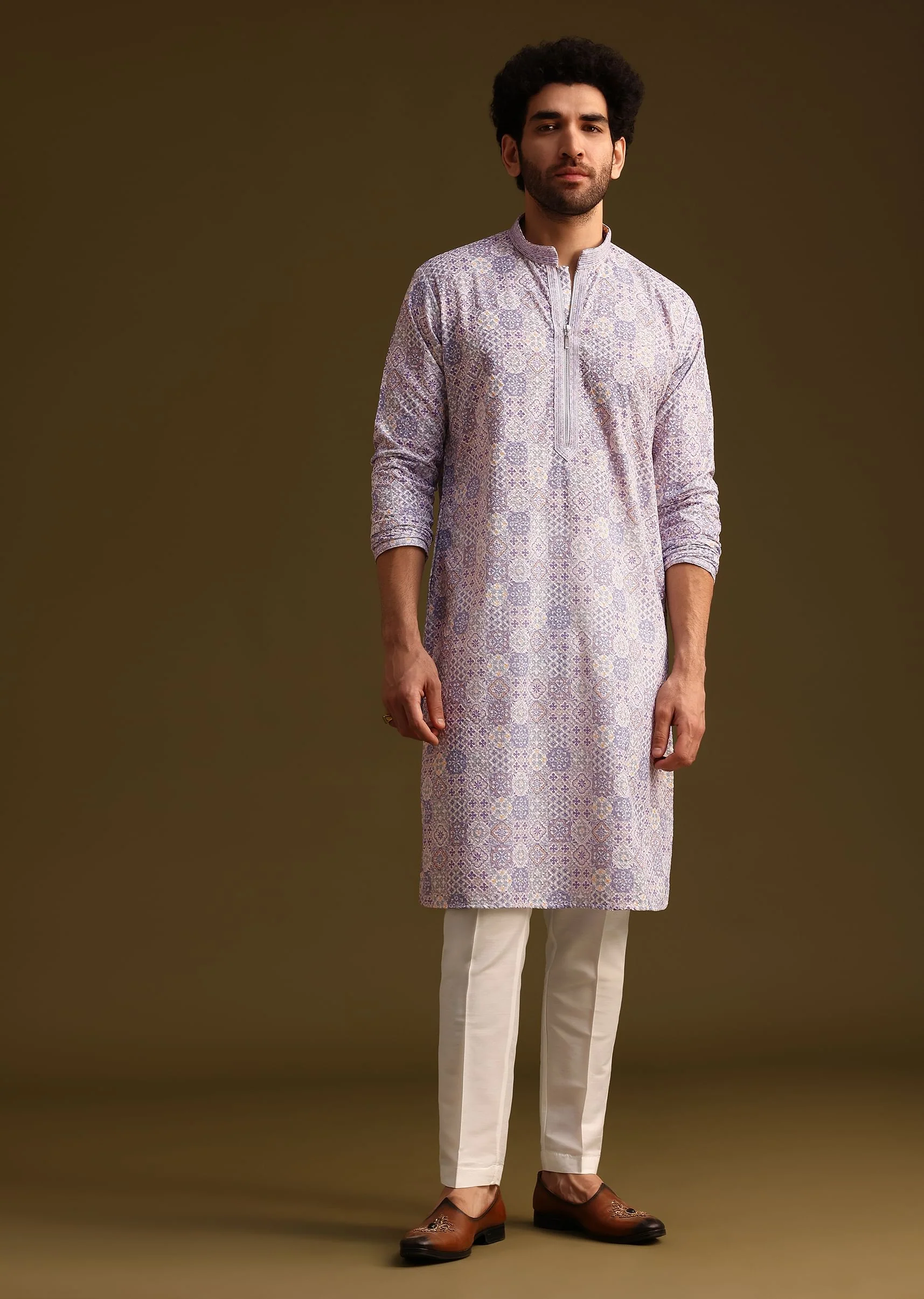 Experience elegance with our Lilac Silk Kurta Set for Men made from luxurious silk that drapes beautifully. This set features intricate digital prints adorned with delicate Schiffli work adding a touch of artistry to your look. Perfect for festive occasions ensuring you stand out effortlessly. Awarded as the Most Trusted Brand, we're delivering styles you love, just as promised.