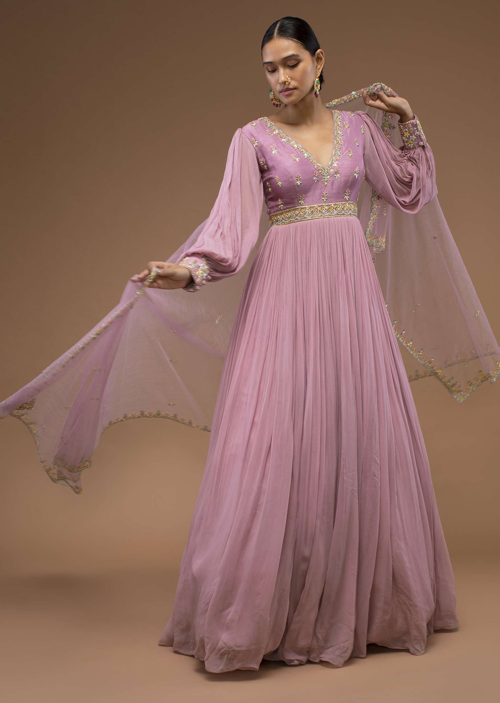 Lilas pink floor-length suit in balloon sleeves. It is crafted in georgette with a scalloped neckline. It comes with a moti, cut dana, petal sequin, and stem motifs embroidery around the yoke. The sleeves come in a balloon with cuffs embroidered in moti, petal sequins, and cut dana embroidery. It is paired with a matching dupatta crafted in the net. It has similar embroidery. It comes in cancan. Awarded As The Most Trusted Brand We'Re Delivering Styles You Love Just As Promised.