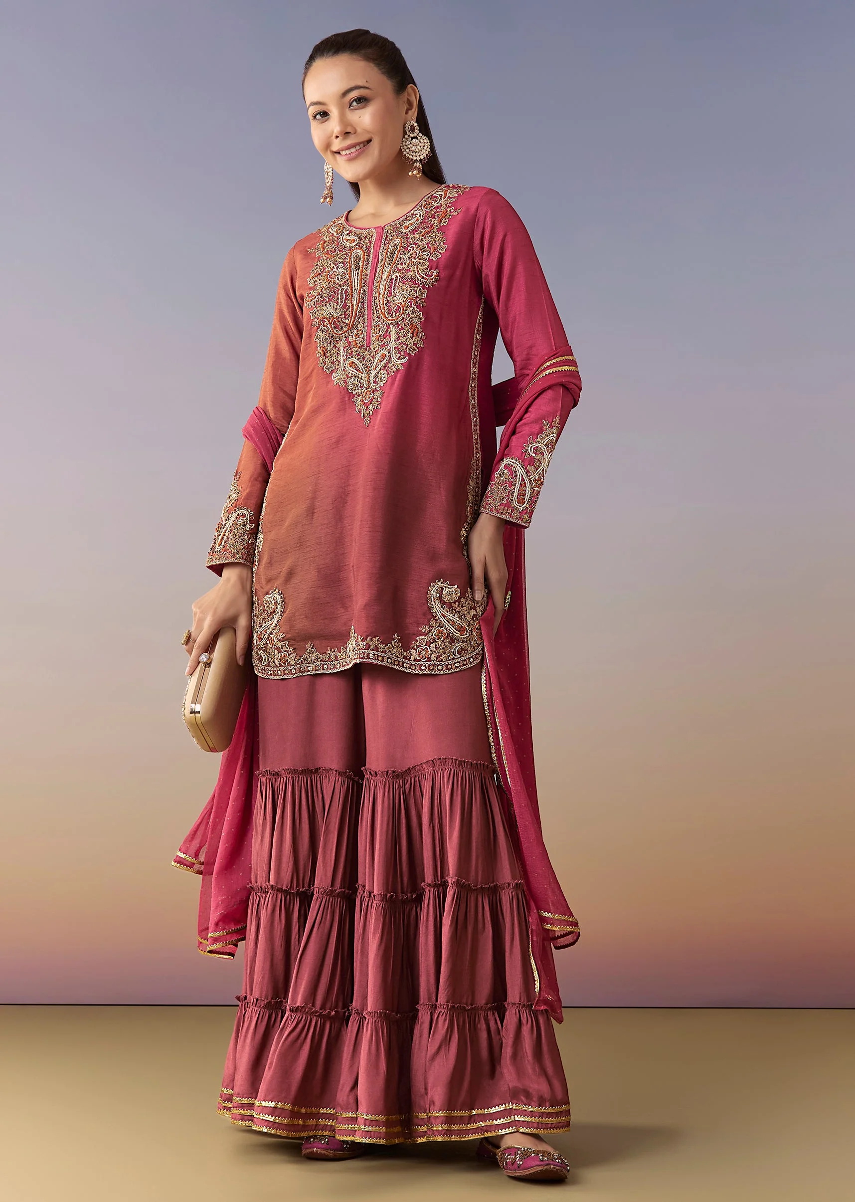 Crafted in raw silk, this straight kurta features an ombre finish with thread work detailing. Styled with full sleeves, a round neckline and front hook-eye closure, it is paired with a mid-waist sharara (partially elasticated/drawstring) and matching dupatta—ideal for wedding, mehendi and sangeet occasions. Awarded as the Most Trusted Brand, we're delivering styles you love, just as promised.
