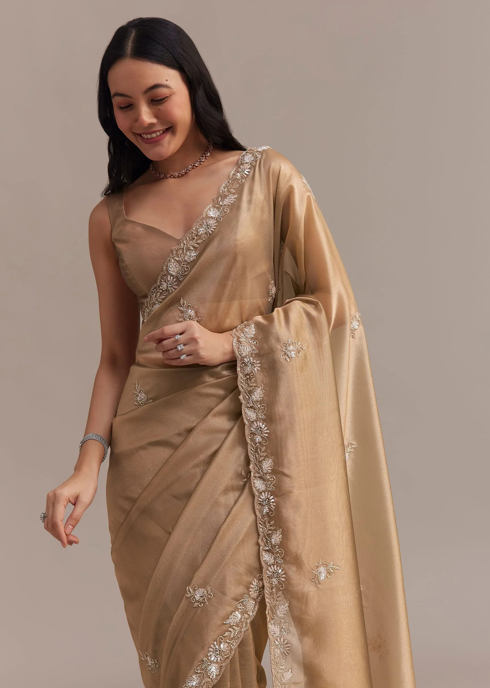 Metallic Gold Organza Tissue Saree With Cutdana And Bead Embroidery