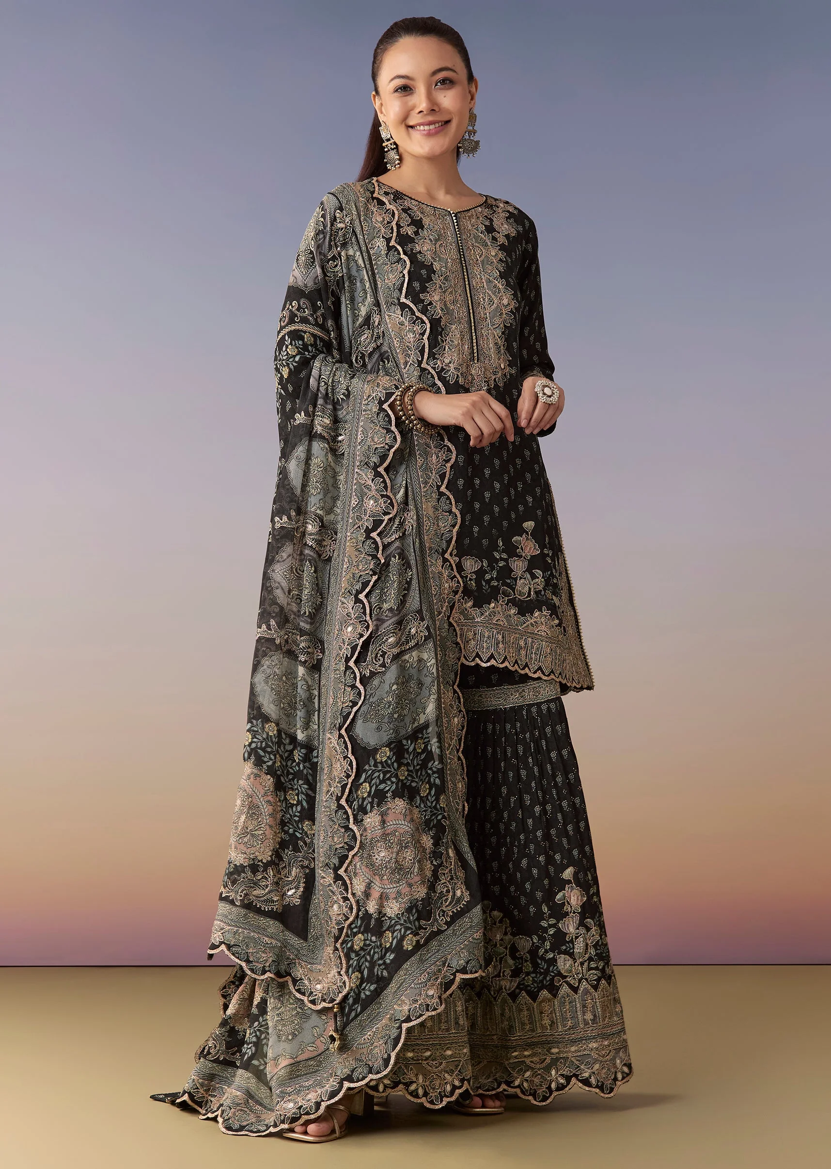Midnight Blue Printed Sharara Suit Set With Dupatta