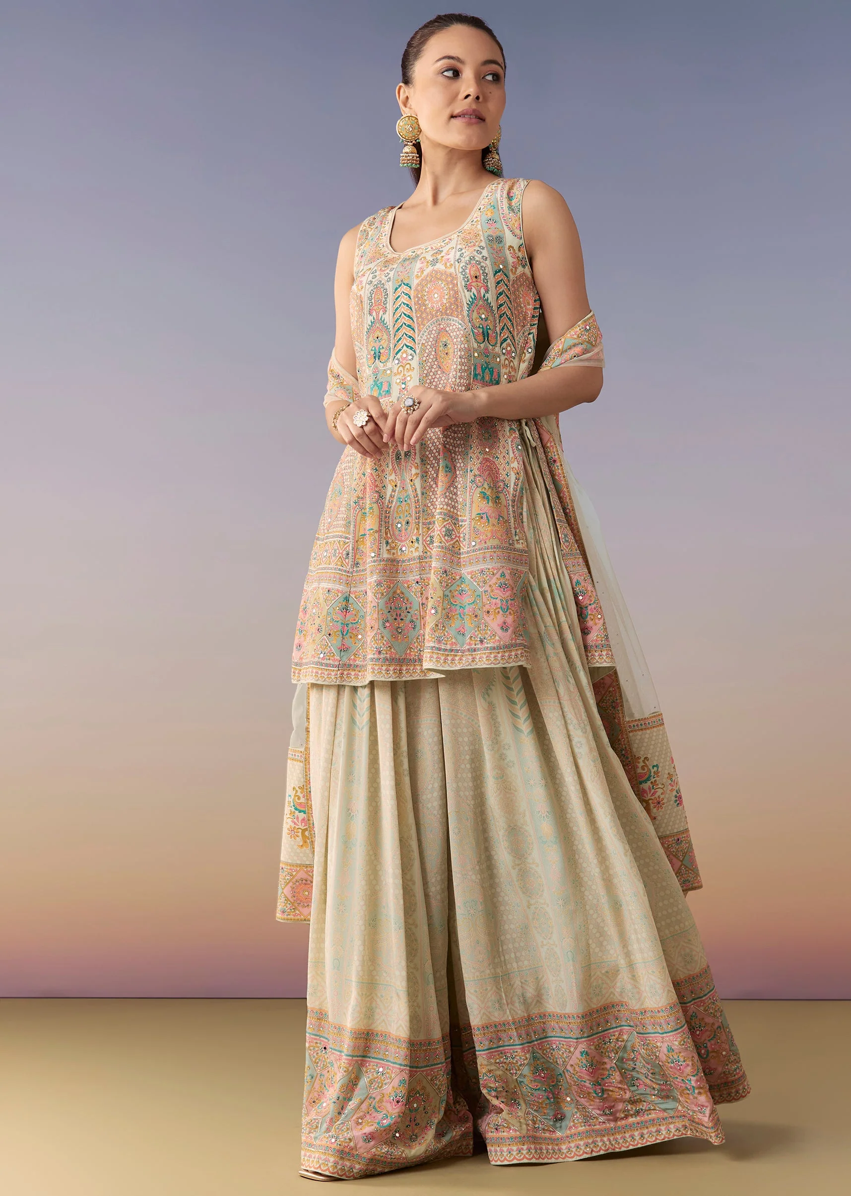 Mint Green Floral Embellished Palazzo Set With Dupatta