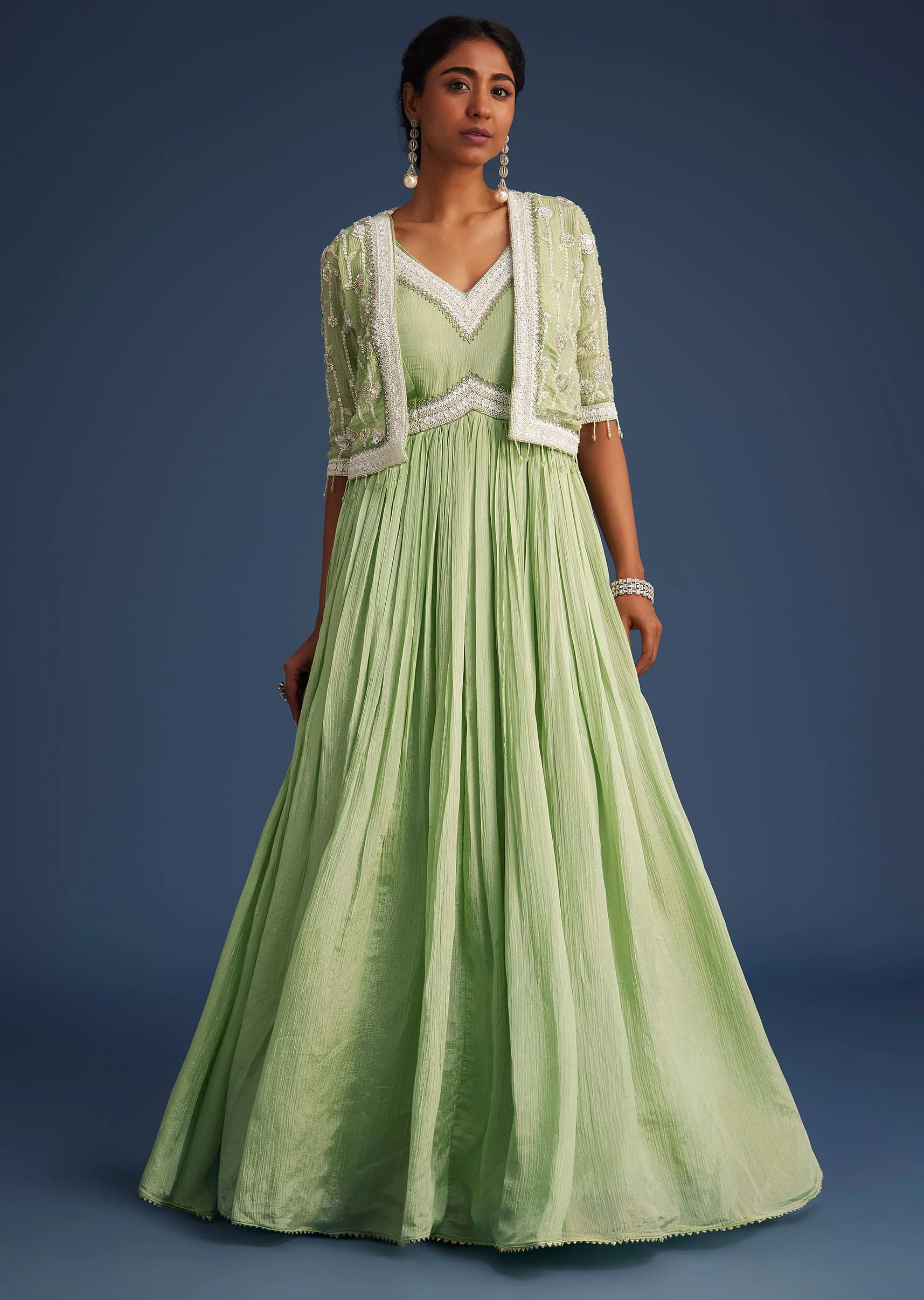 -70%Mint Green Tissue Gown With Embroidered Jacket—