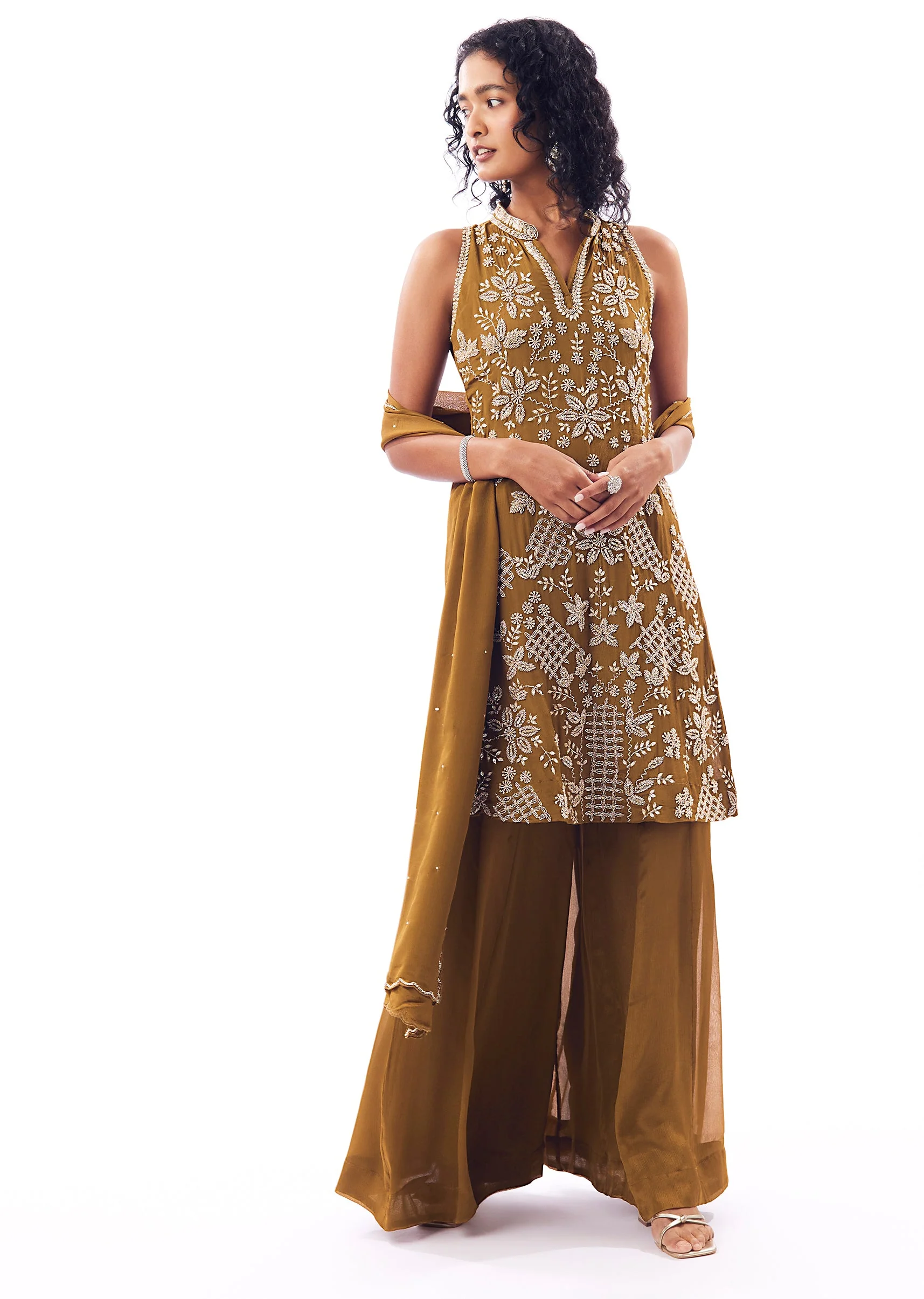 A festive palazzo suit in chinon featuring a knee-length straight kurta finished with bead and cutdana work. Styled with a partially elasticated wide palazzo and a matching dupatta, this set is easy to carry and ideal for reception and festive occasions. Awarded as the Most Trusted Brand, we're delivering styles you love, just as promised.