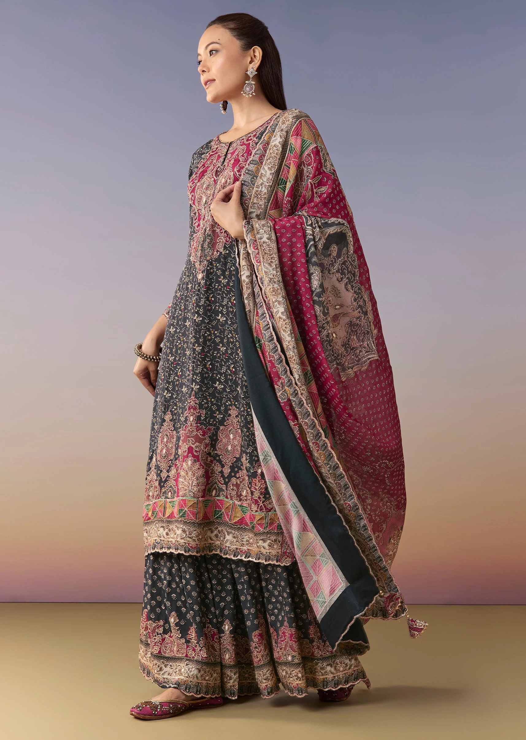 Crafted in crepe, this straight kurta features floral prints highlighted with stone detailing. Designed with a round neckline, 3/4th sleeves and side zip closure, it is paired with a mid-waist sharara (partially elasticated) and matching dupatta—perfect for mehendi and wedding festivities. Awarded as the Most Trusted Brand, we're delivering styles you love, just as promised.