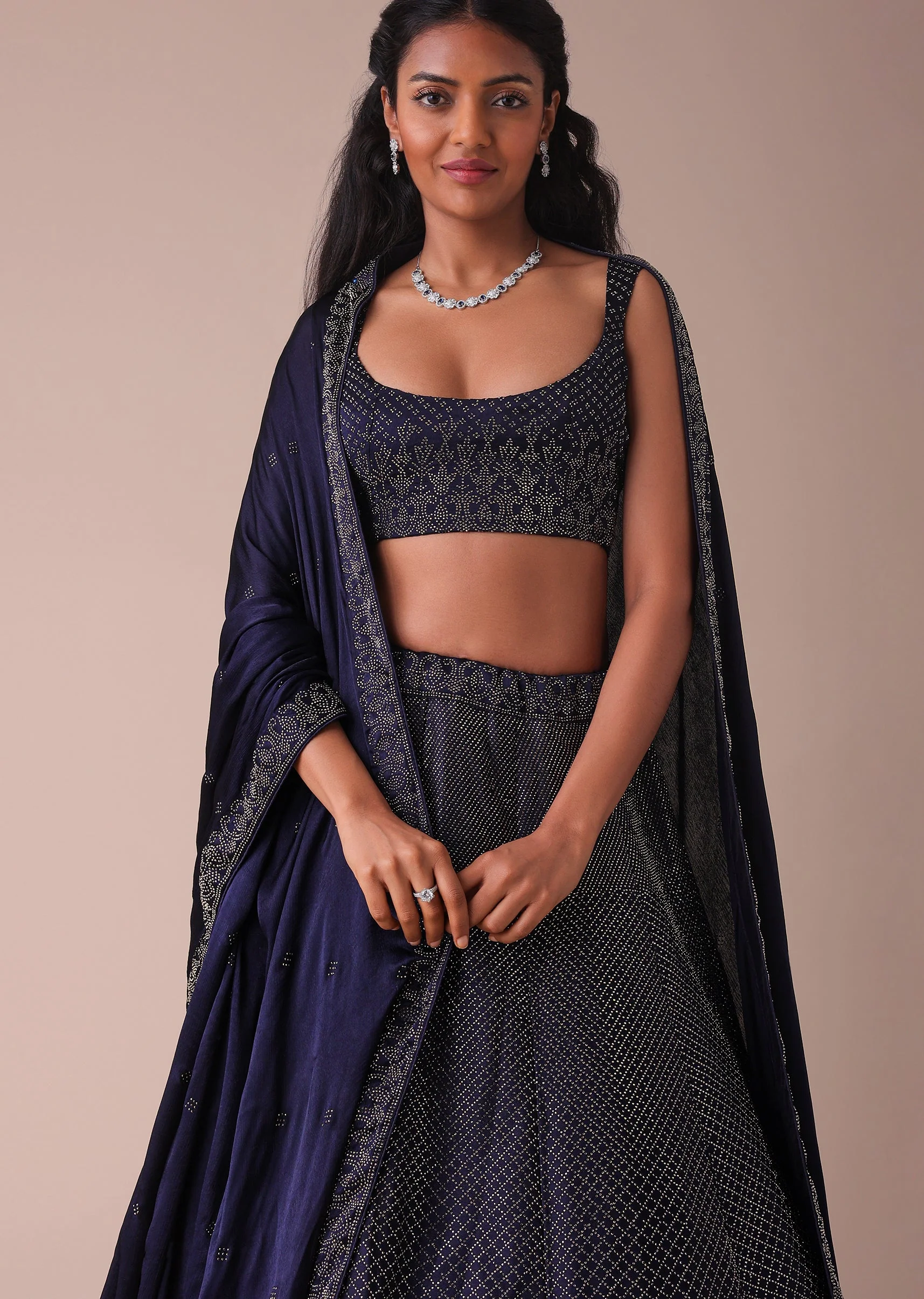 Navy Blue Wrinkle Satin Lehenga With Swarovski Crystals