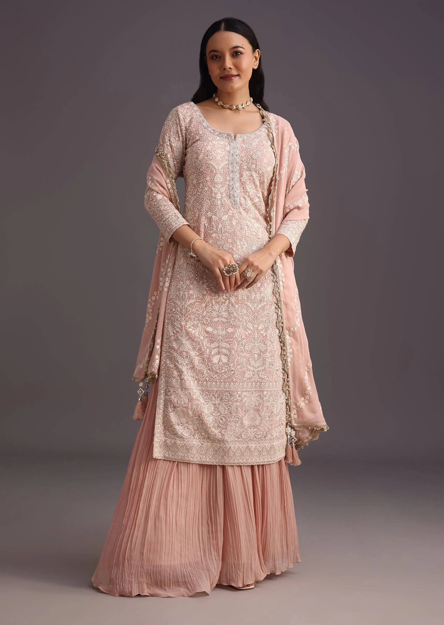 Peach Lucknowi Work Kurta Set With Flared Palazzo And Resham Dupatta