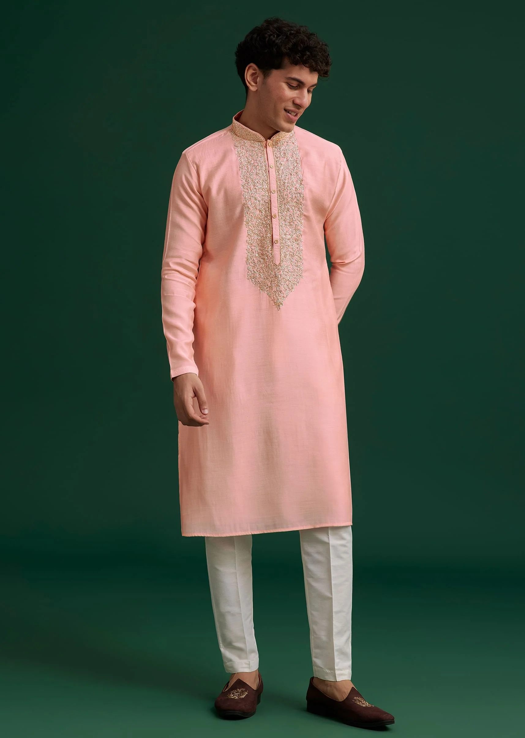 - Exude Refined Sophistication With This Peach Silk Kurta Set Adorned With Intricate Hand Embroidery On The Yoke That Enhances Its Regal Charm.
