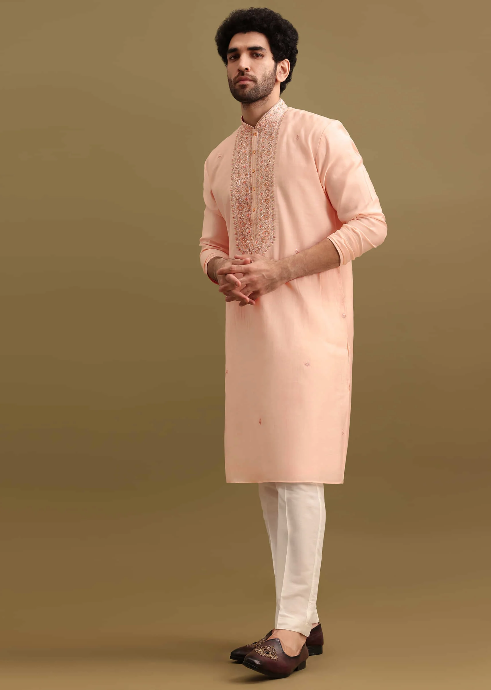 Embrace opulence with our peach kurta set. Adorned with exquisite zari work and intricate hand detailing, this set exudes refined elegance. The silky fabric flows effortlessly, while the zari accents shimmer with each step. Perfect for any festive event. The kurta is paired with pants. Button design, shape, and size may vary as per availability. Awarded as the Most Trusted Brand, we're delivering styles you love, just as promised.