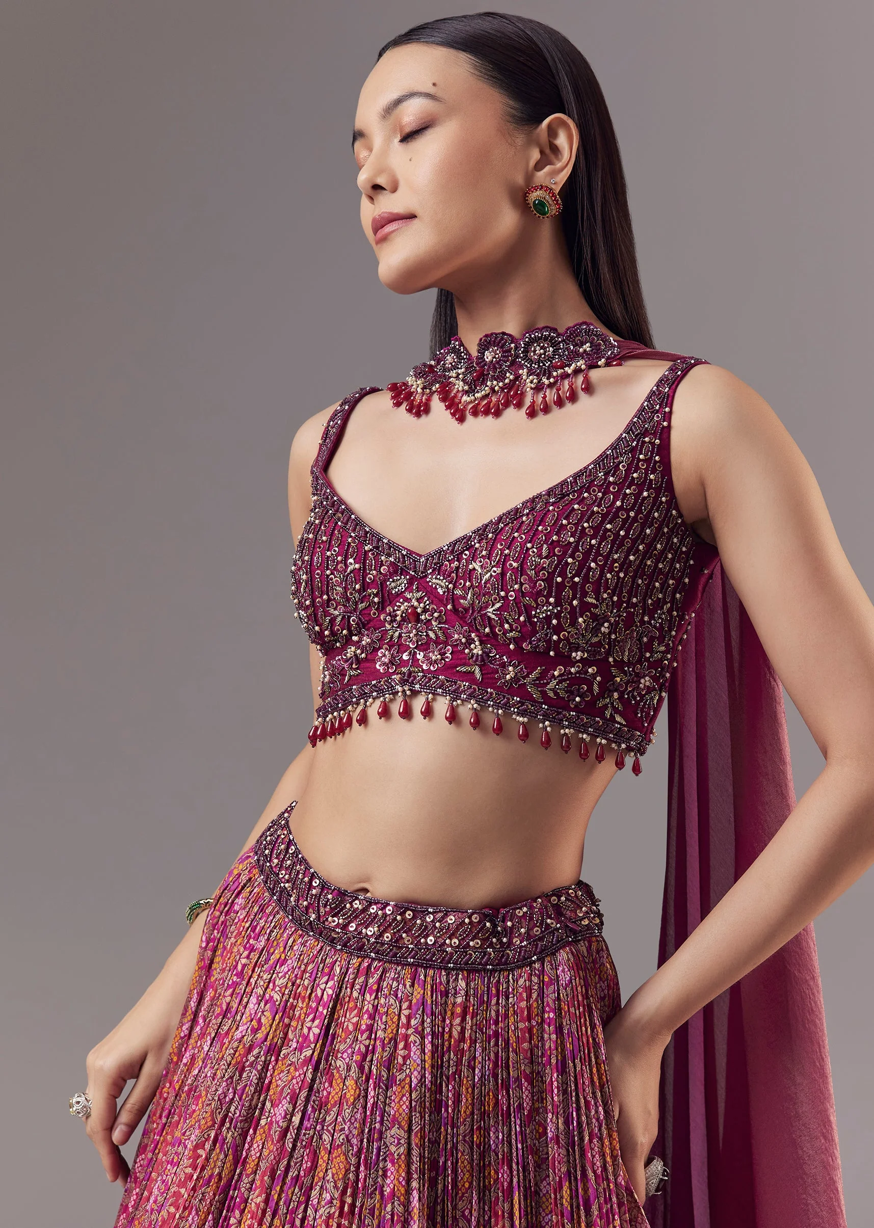 Designed to capture youthful elegance, this pink lehenga set blends modern styling with intricate hand craftsmanship. The sleeveless blouse features delicate hand embroidery with beads, thread and resham, and cut dana work, finished with playful tassel detailing and a flattering V neckline. Paired with a ruched satin lehenga that adds texture and fluid movement, the look is completed with a stylish choker style dupatta. Perfect for weddings, festive celebrations, and special occasions where contemporary charm meets tradition. Awarded as the Most Trusted Brand, we're delivering styles you love, just as promised.