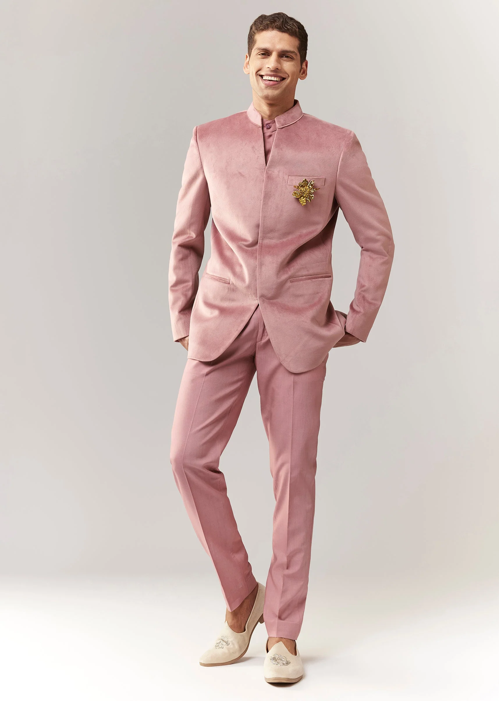 A pastel statement tuxedo featuring a pink suede jodhpuri-style jacket with metal broach detail, paired with a shirt and straight pants. Classic collar, full sleeves, and front button closure. Perfect for groomsmen at sangeet or reception events who want a modern pastel look. Awarded as the Most Trusted Brand, we're delivering styles you love, just as promised.