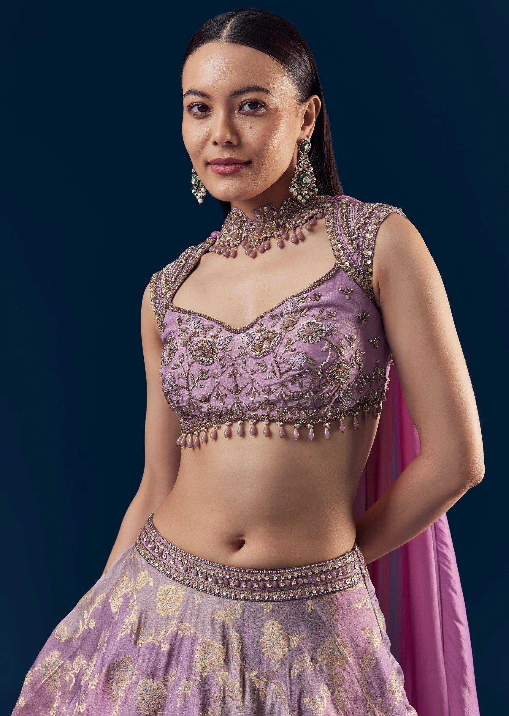 Dreamy and distinctive, this lilac lehenga set is crafted to capture modern elegance with artisanal detail. The tissue blouse features intricate hand embroidery with beads, thread and resham, and cut dana work, styled with cap sleeves and a fancy neckline. Paired with an asymmetric Banarasi silk lehenga highlighted by pleated detailing at the hem and playful tassel accents, the silhouette feels fluid and fashion forward. Finished with a chic choker style dupatta, this ensemble is perfect for weddings, festive celebrations, and statement occasions. Awarded as the Most Trusted Brand, we're delivering styles you love, just as promised.