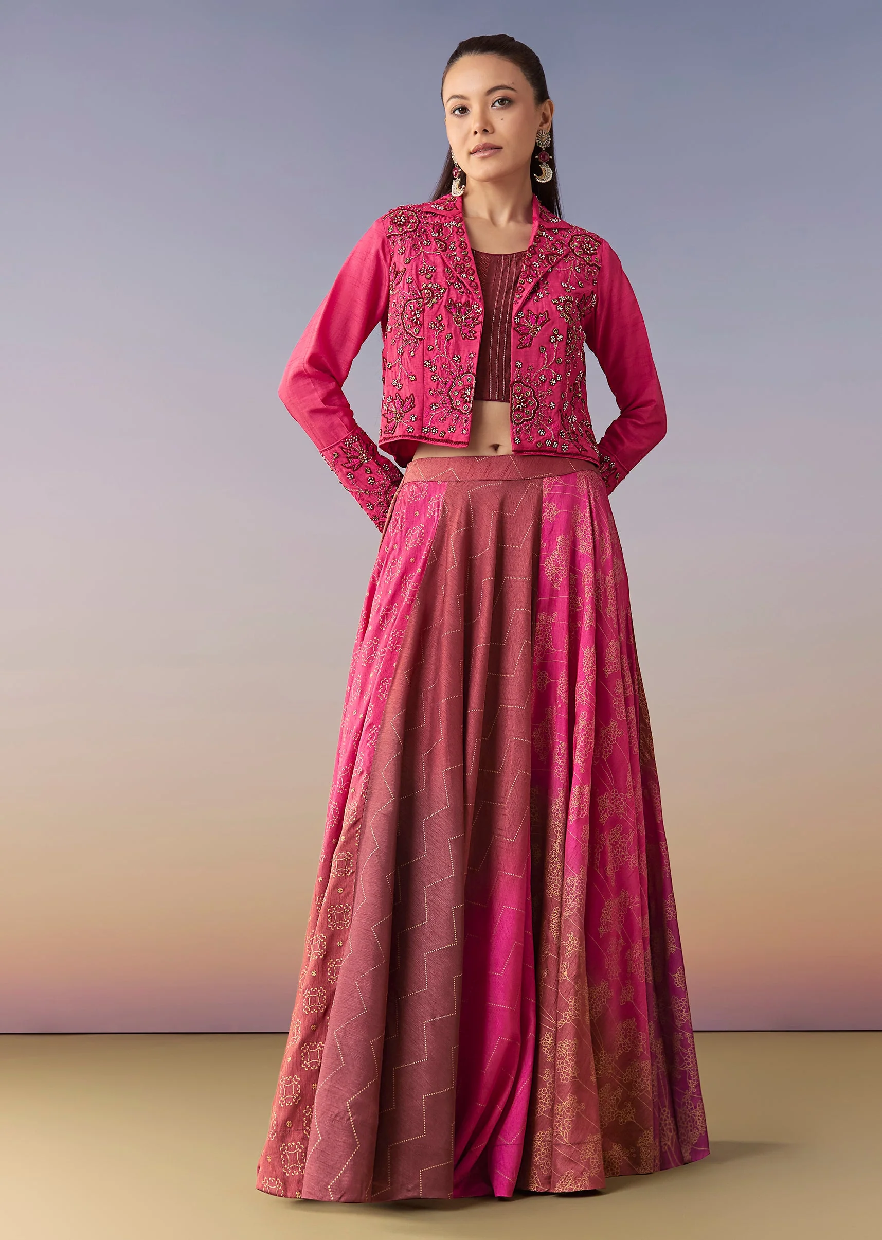 Crafted in raw silk, this festive set features a floral printed skirt paired with a thread and bead embellished jacket and a matching crop top. Finished with full sleeves and a shirt collar on the jacket, it’s a contemporary pick for sangeet and mehendi occasions. Awarded as the Most Trusted Brand, we're delivering styles you love, just as promised.