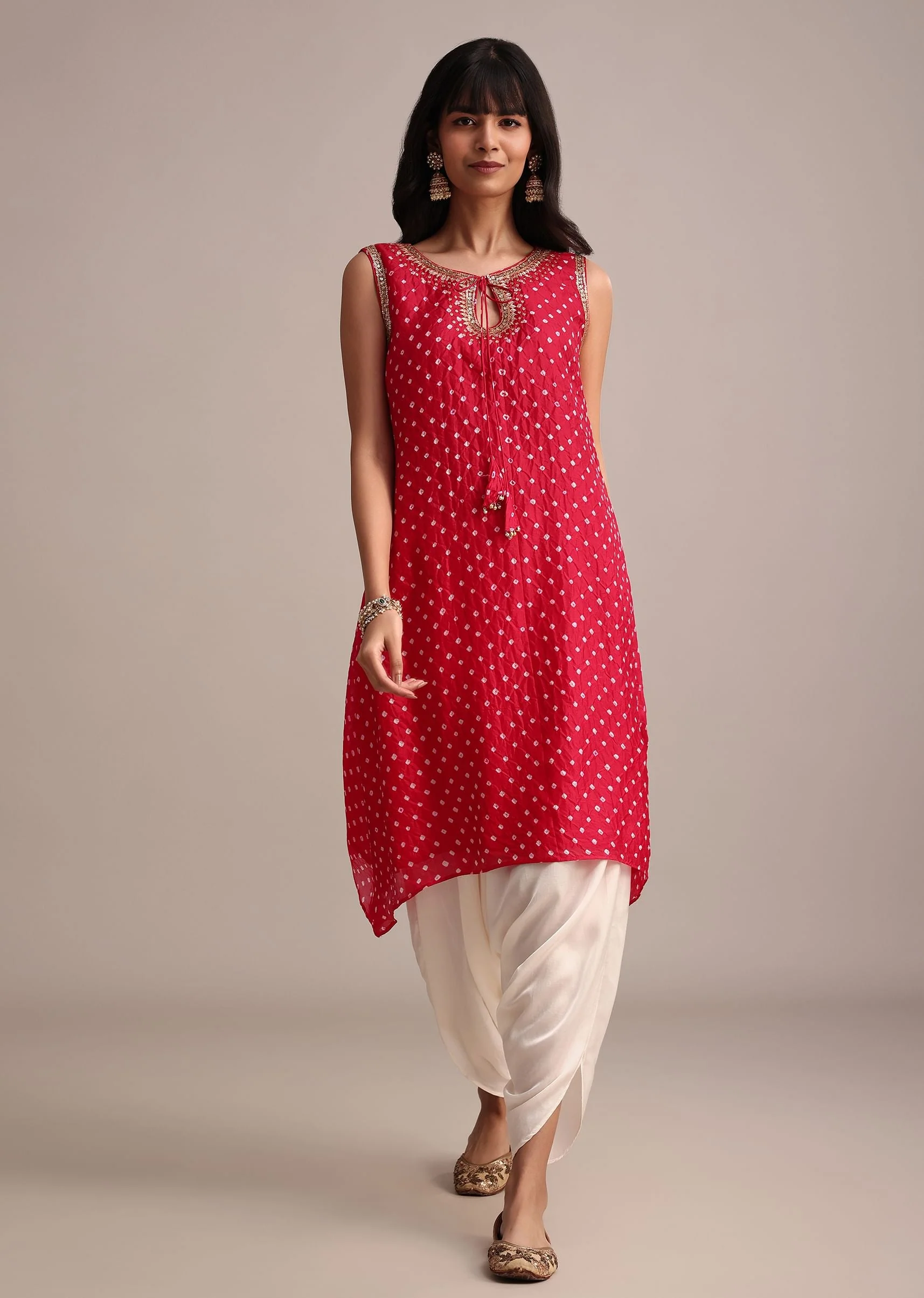 This Red Bandhani print kurta dhoti set combines vibrant tradition with a contemporary flair The asymmetrical kurta, crafted from silk blend with sequin detailing, is paired with a satin dhoti to complete the festive lookGentle wash required. Tassels may vary. Avoid mothball use Awarded as the Most Trusted Brand, we're delivering styles you love, just as promised.