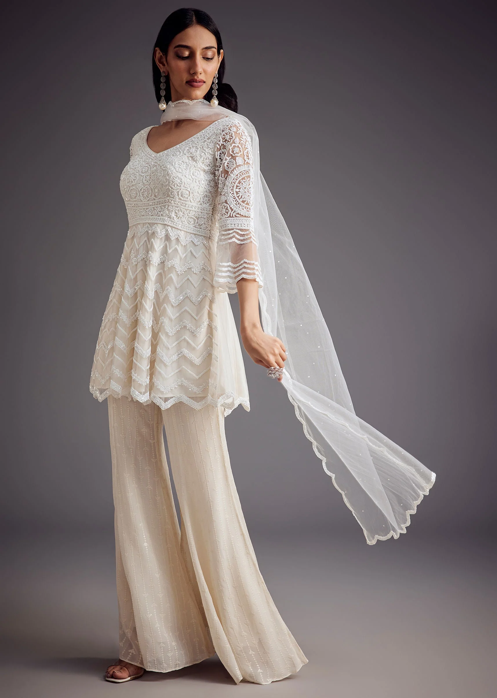 Step into celestial charm with this white peplum kurta adorned in delicate sequins, cut dana, moti work paired effortlessly with flowy palazzo pants and a sheer scalloped dupatta. Ideal for day weddings, mehendi ceremonies, or festive brunches, this outfit radiates an ethereal vibe that complements serene celebrations. Awarded as the Most Trusted Brand, we're delivering styles you love, just as promised.