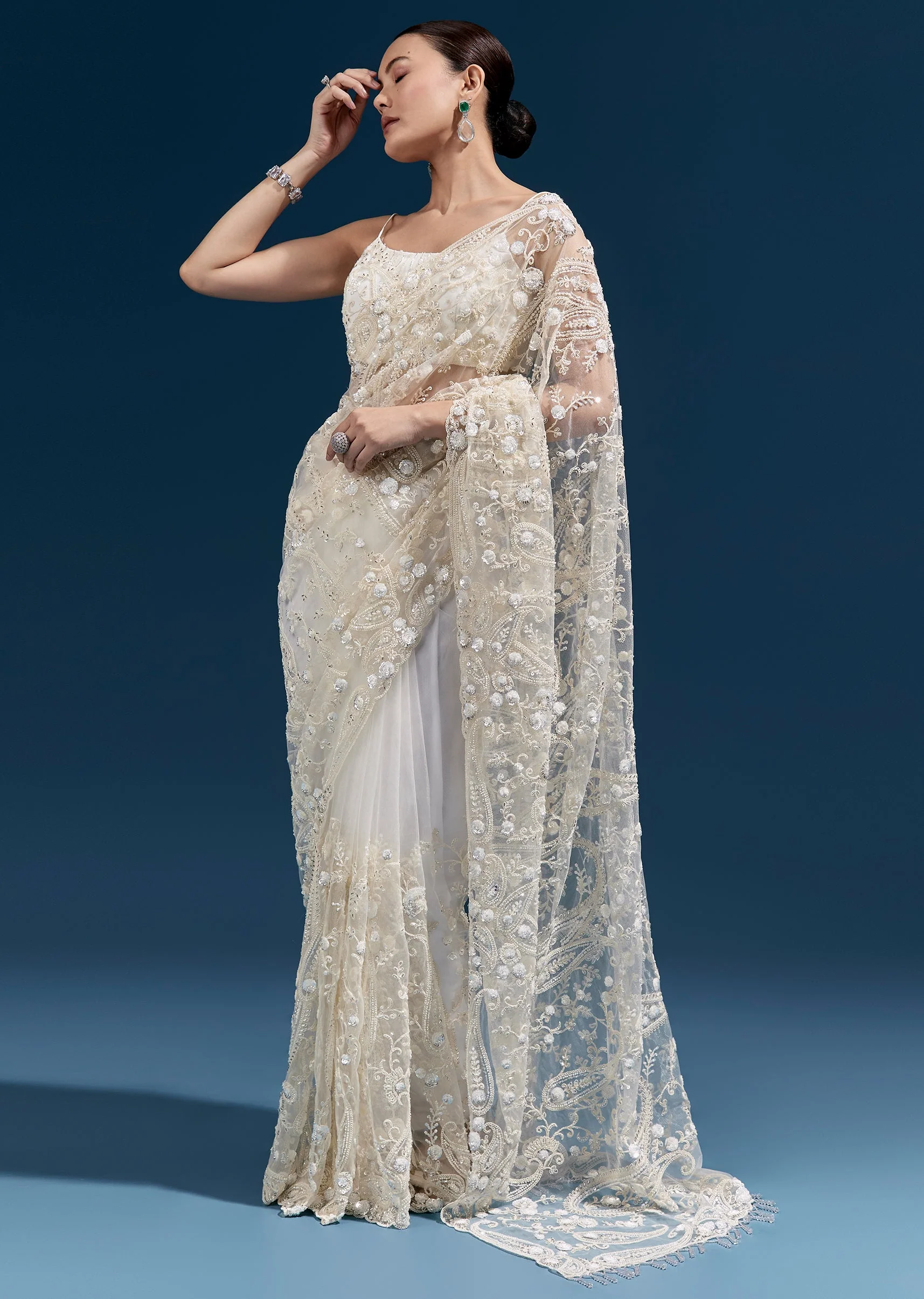 This white net saree features heavy floral embroidery with cutdana, sequins and beads all over, finished with tassels at the pallu end. A stunning pick for mehendi, engagement, sangeet and reception looks with an elevated glam feel. Awarded as the Most Trusted Brand, we're delivering styles you love, just as promised.