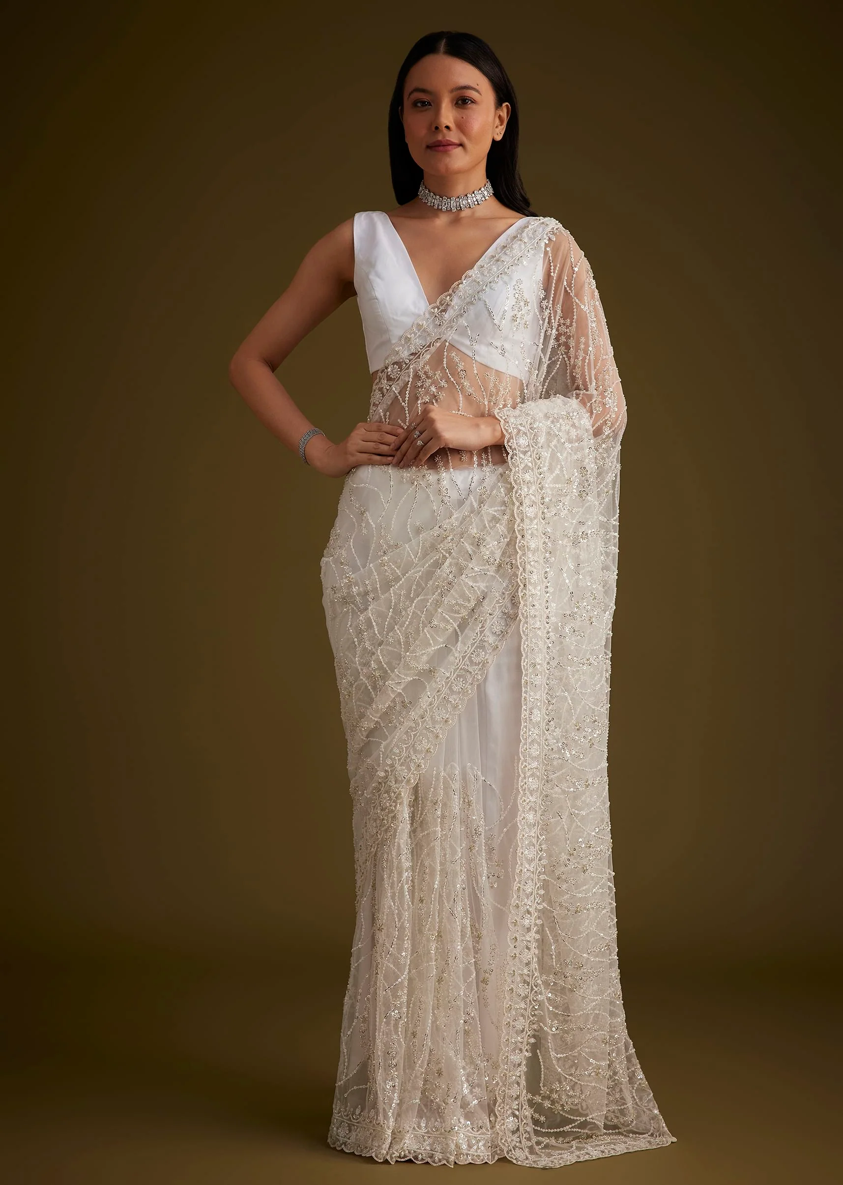 - Drape Yourself In The Ethereal Charm Of This White Net Saree, Exquisitely Detailed With Intricate Sequin And Stone Embroidery.