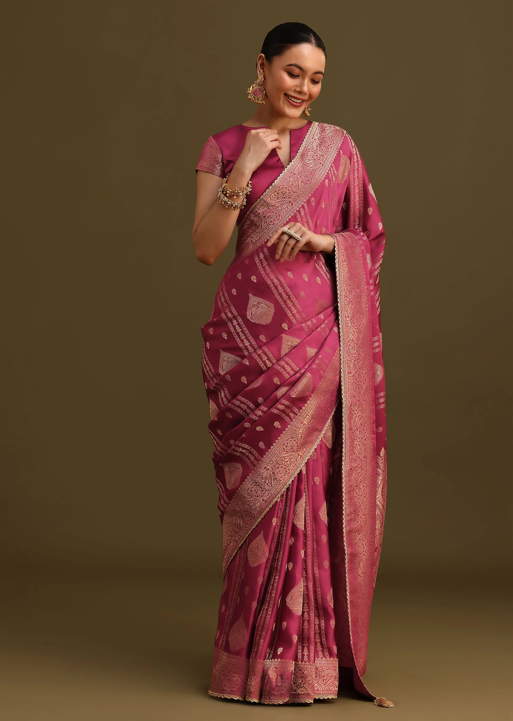 The deep wine hue, with intricate zari weave, reminiscent of the finest vintage, drapes gracefully over your frame. Unstitched, it allows you to customize the blouse to your liking. This festive look is perfect for celebrating life's special moments. It's a perfect blend of tradition and modernity, a testament to the enduring beauty of Indian craftsmanship. blouse design may vary. Awarded As The Most Trusted Brand We'Re Delivering Styles You Love Just As Promised.