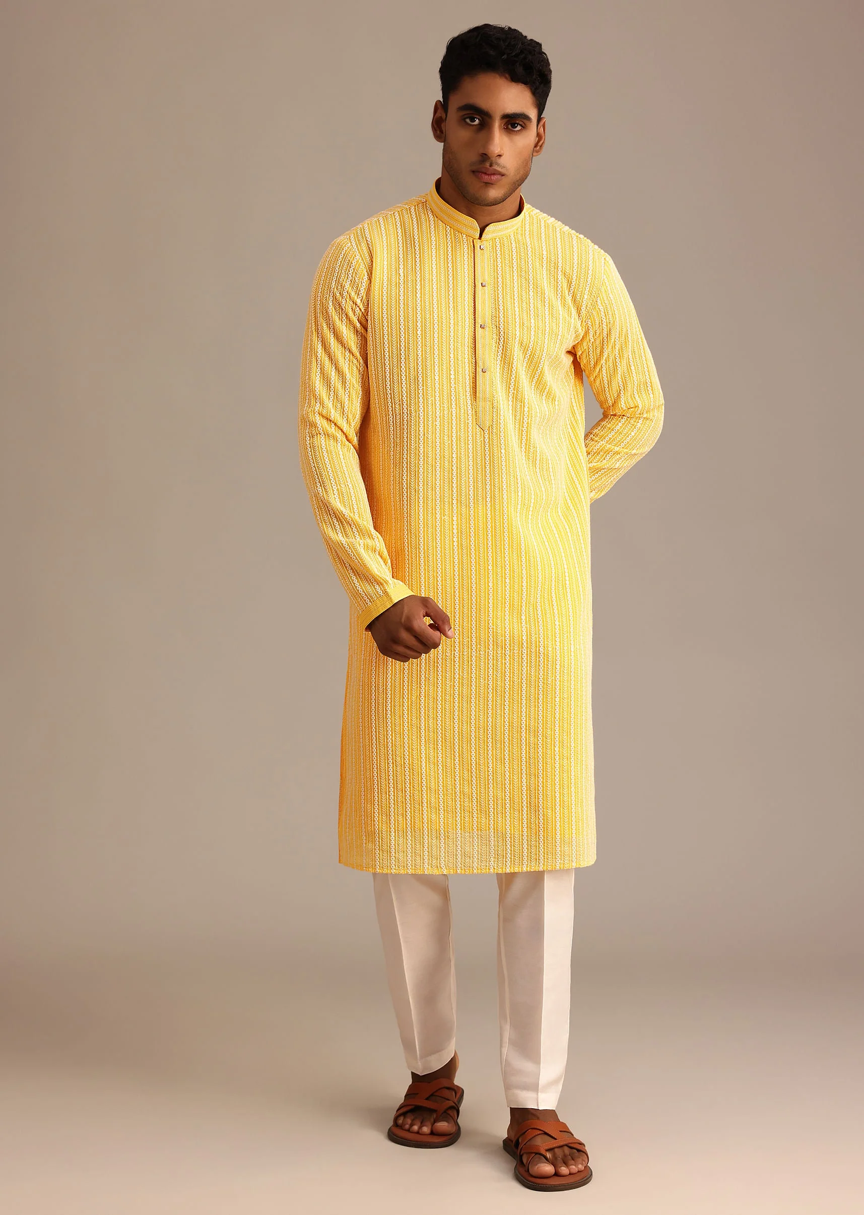 Celebrate your unique self with this exquisite style that will captivate everyone's attention. Beautifully designed on a sunshine yellow base, this set is crafted from rich georgette. Adorned with all over resham and thread work in a striped pattern, the kurta features a mandarin collar and full sleeve design, making it an ideal choice for joyous festivals and wedding celebrations. Awarded as the Most Trusted Brand, we're delivering styles you love, just as promised.
