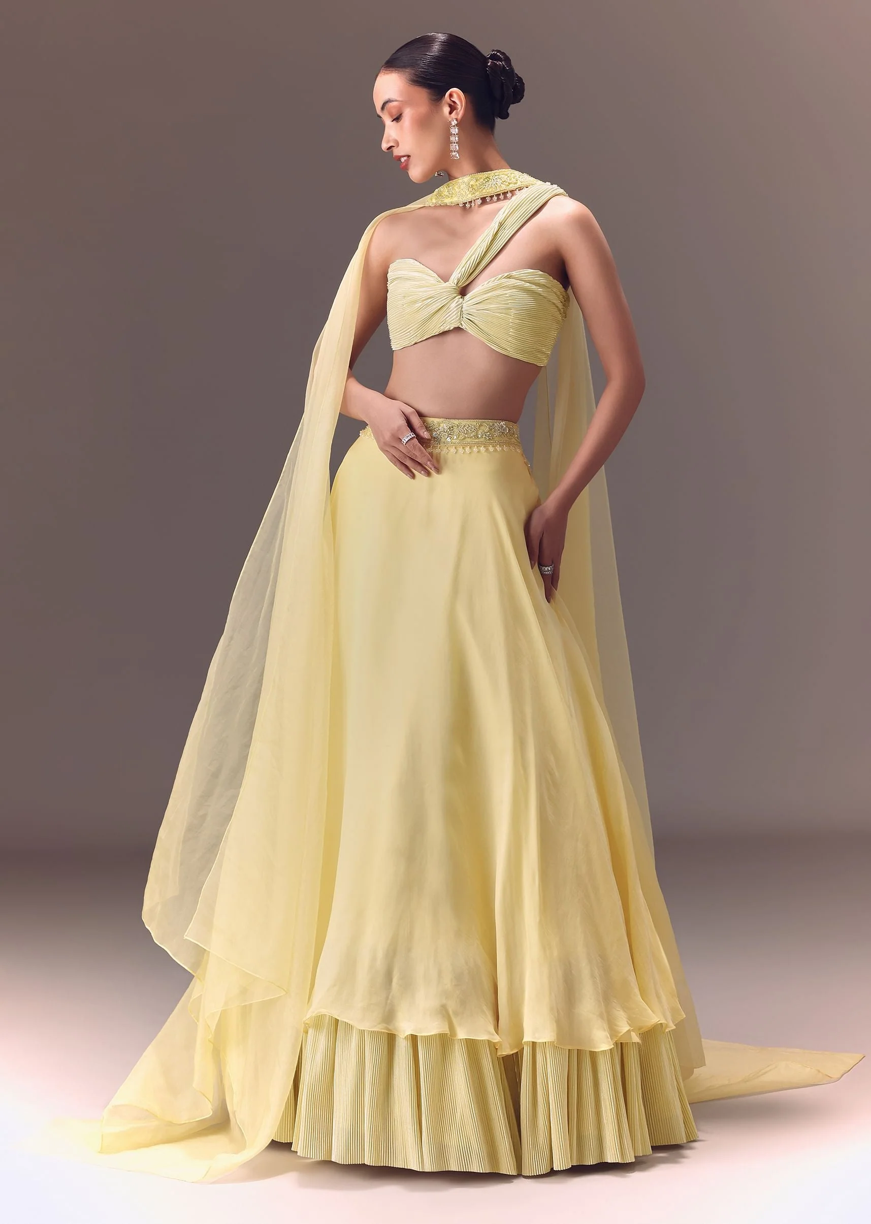 Yellow Pre-Pleated One Shoulder Blouse With Frill Lehenga And Choker Dupatta